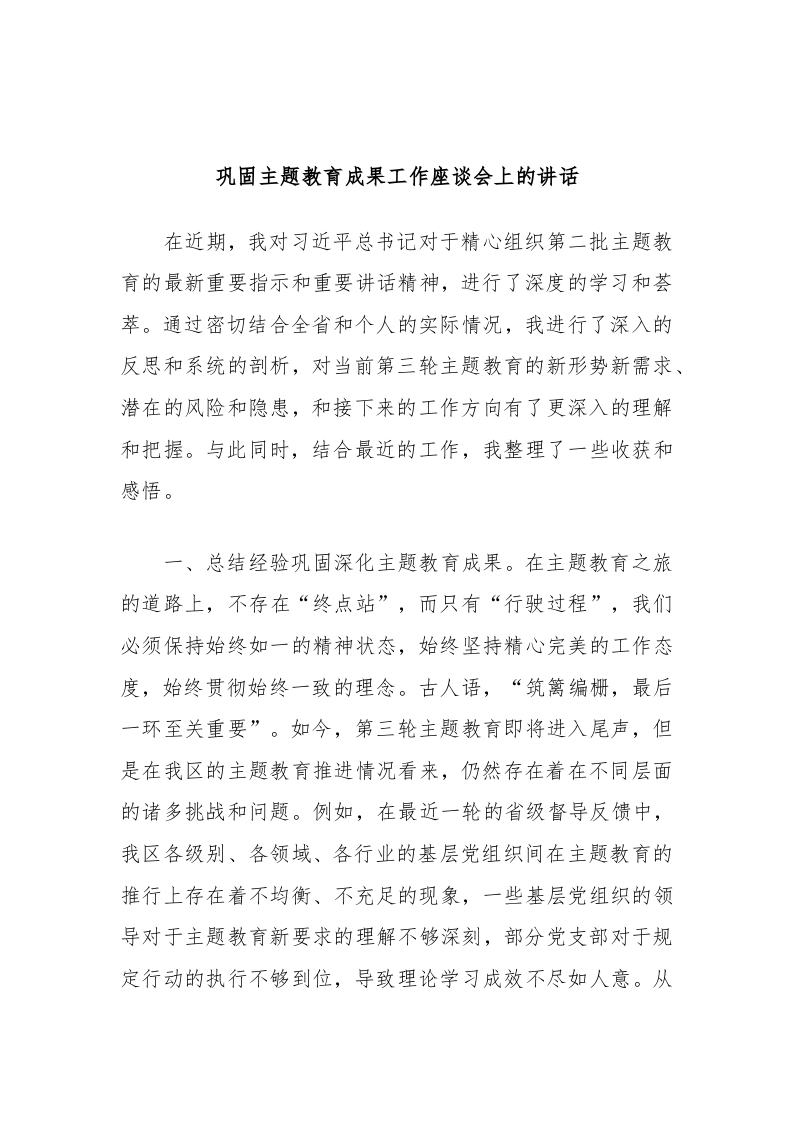 / 巩固主题教育成果工作座谈会上的讲话稿