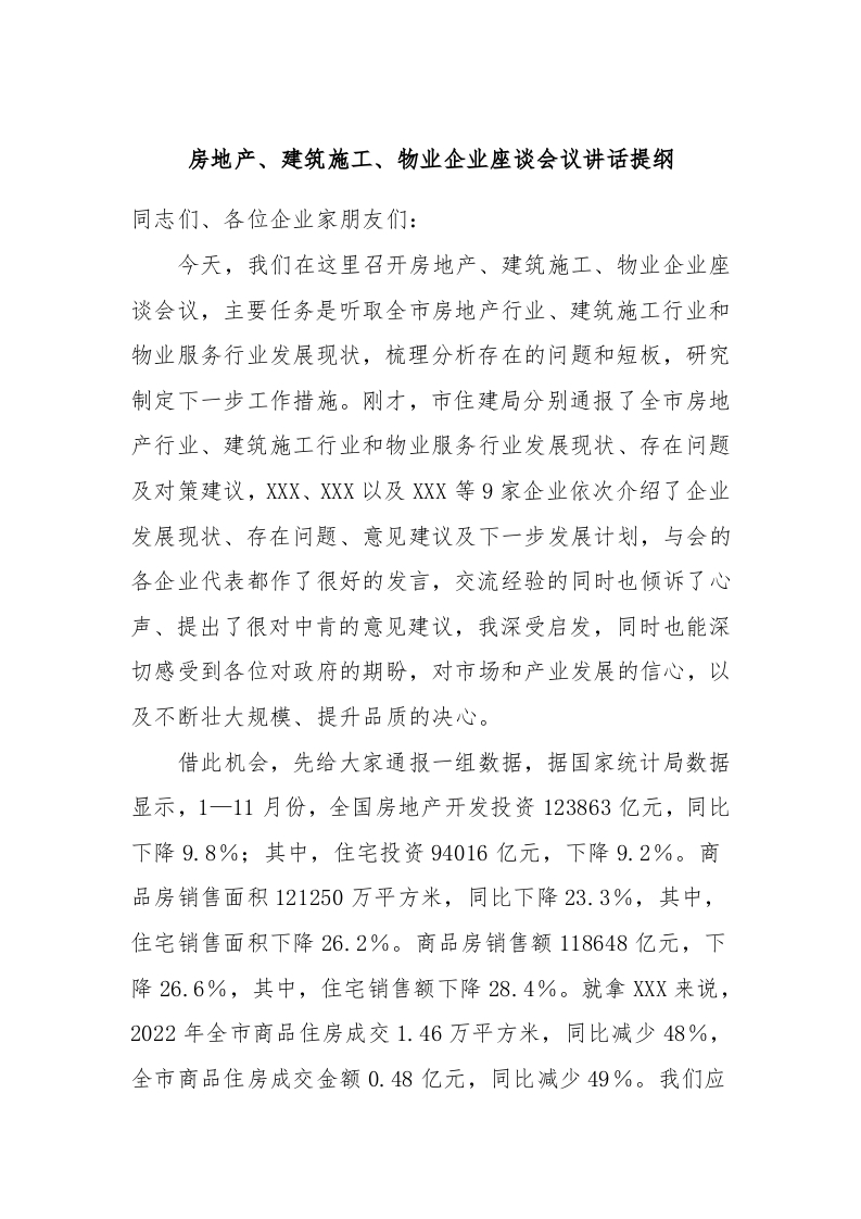 / 房地产、建筑施工、物业企业座谈会议讲话稿提纲
