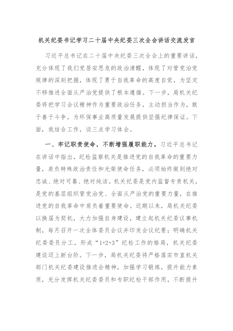 / 机关纪委书记学习二十届中央纪委三次全会讲话稿交流发言稿