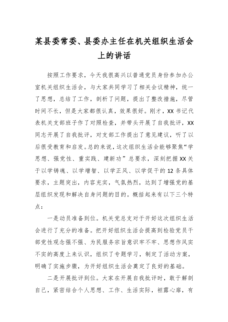 / 某县委常委、县委办主任在机关组织生活会上的讲话稿