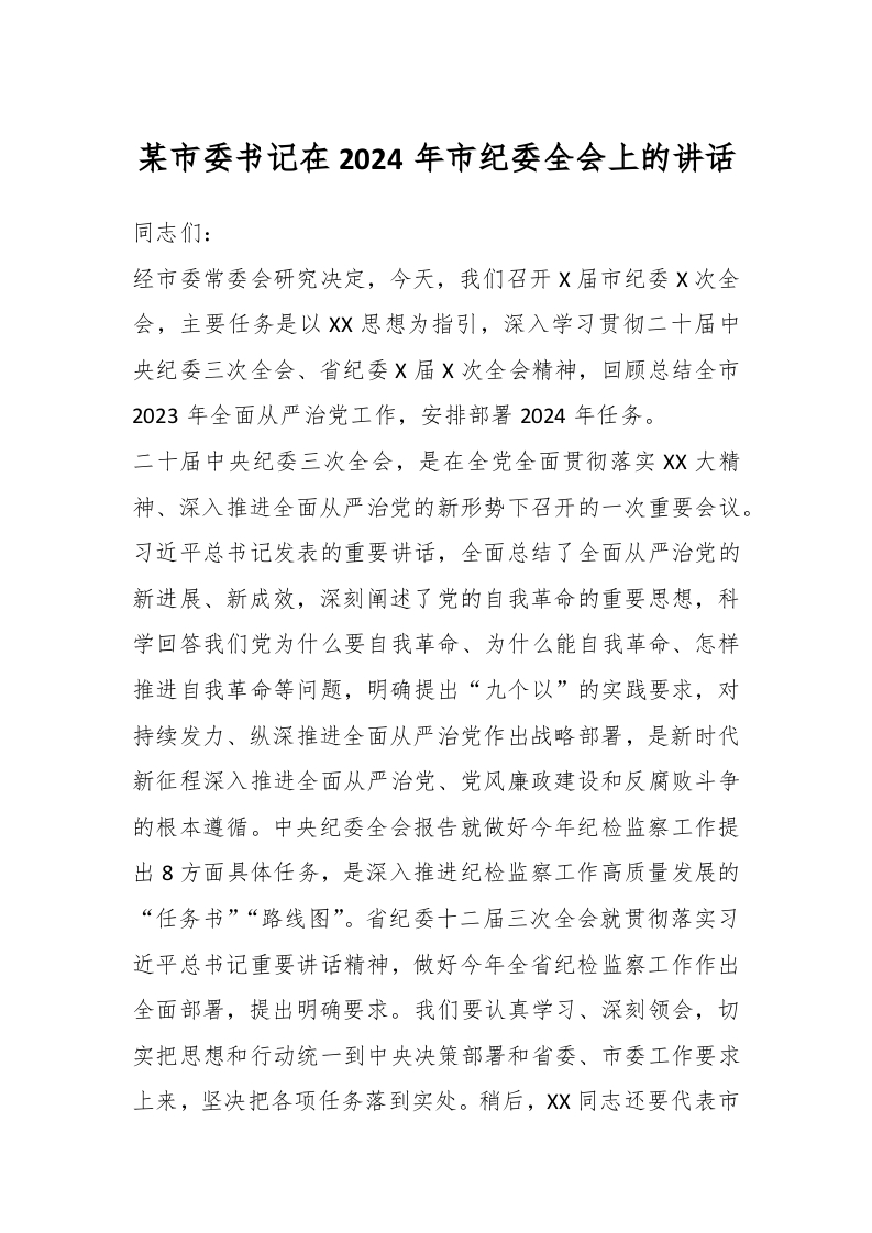 / 某市委书记在2024年市纪委全会上的讲话稿