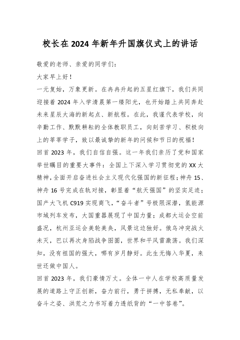 / 校长在2024年新年升国旗仪式上的讲话稿