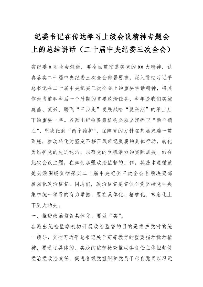 / 纪委书记在传达学习上级会议精神专题会上的总结讲话稿(二十届中央纪委三次全会)