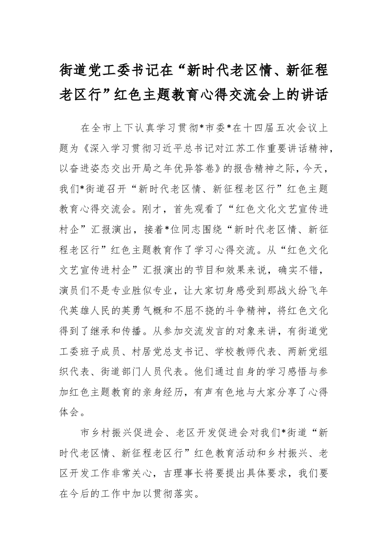 / 街道党工委书记在“新时代老区情、新征程老区行”红色主题教育心得交流会上的讲话稿
