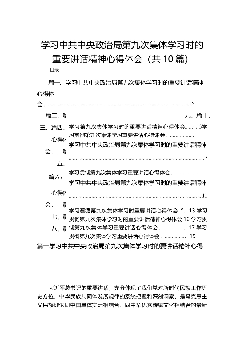 (10篇)学习中共中央政治局第九次集体学习时的重要讲话稿精神心得体会