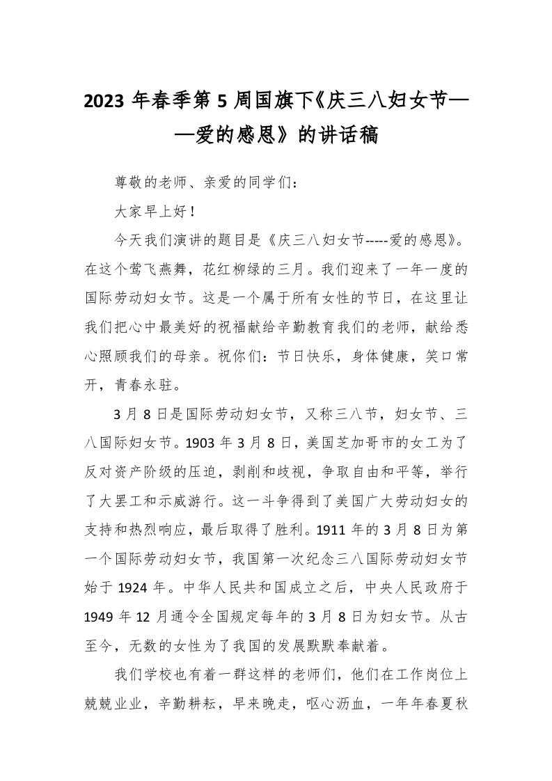 / 2023年春季第5周国旗下《庆三八妇女节——爱的感恩》的讲话稿稿