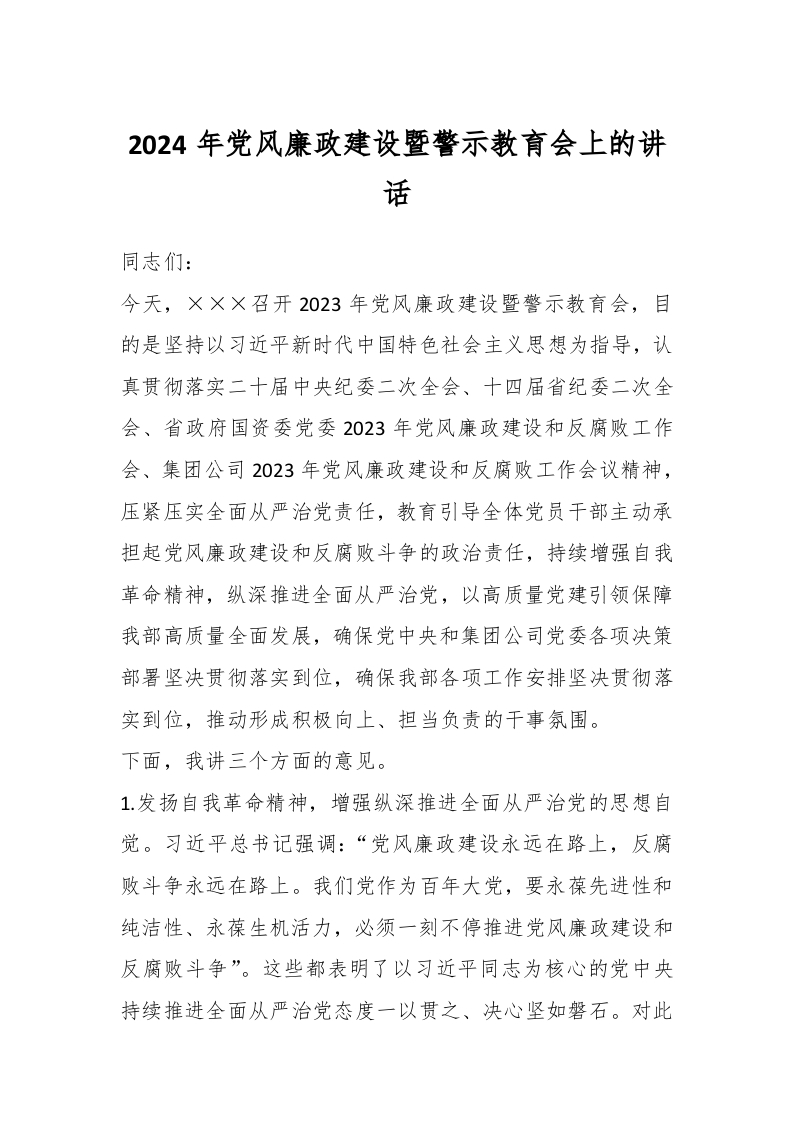 / 2024年党风廉政建设暨警示教育会上的 讲话稿