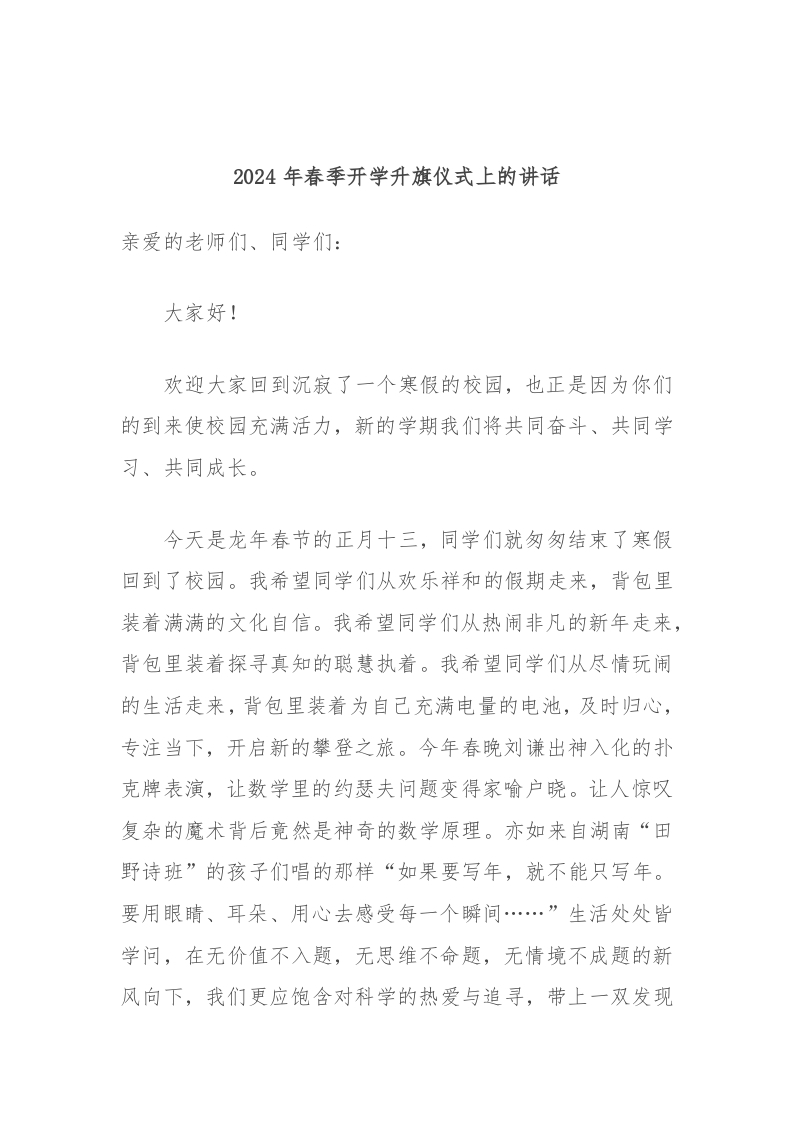 2024年春季开学升旗仪式上的讲话稿