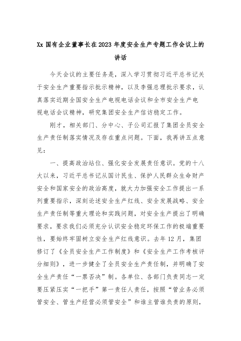 Xx国有企业董事长在2023年度安全生产专题工作会议上的讲话稿