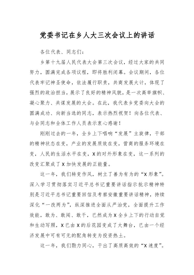 / 党委书记在乡人大三次会议上的讲话稿