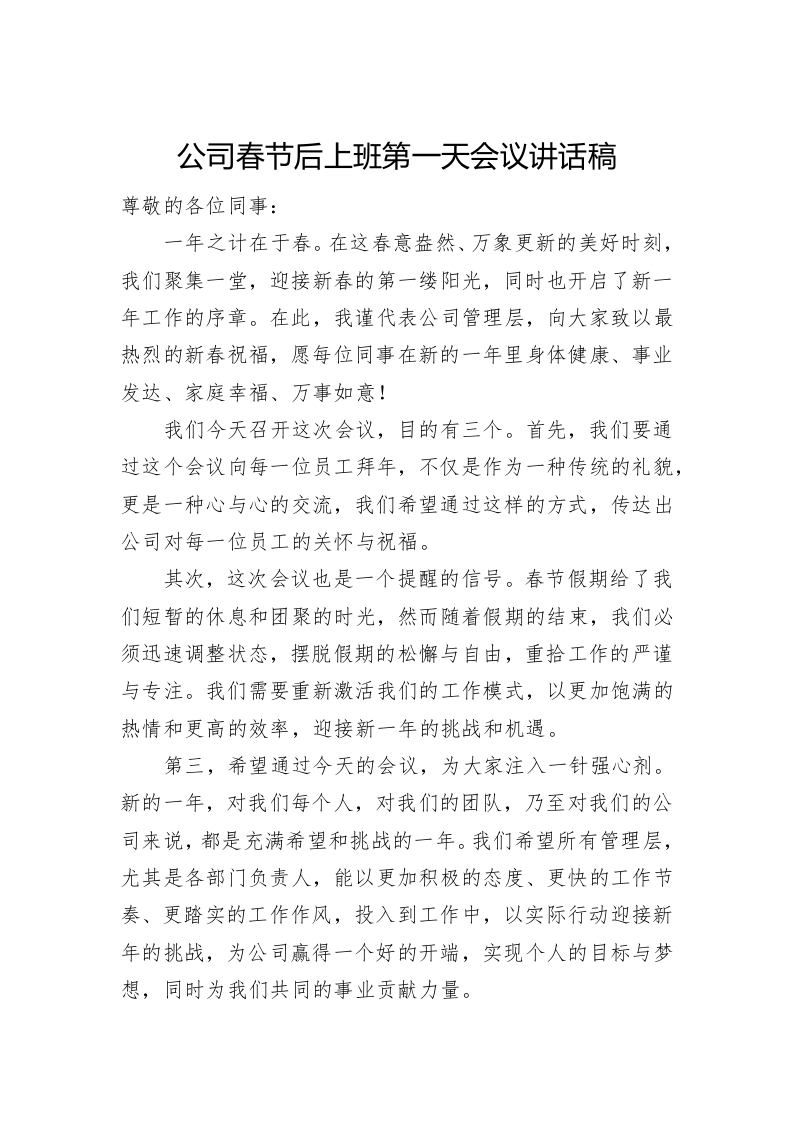 / 公司春节后上班第一天会议讲话稿稿