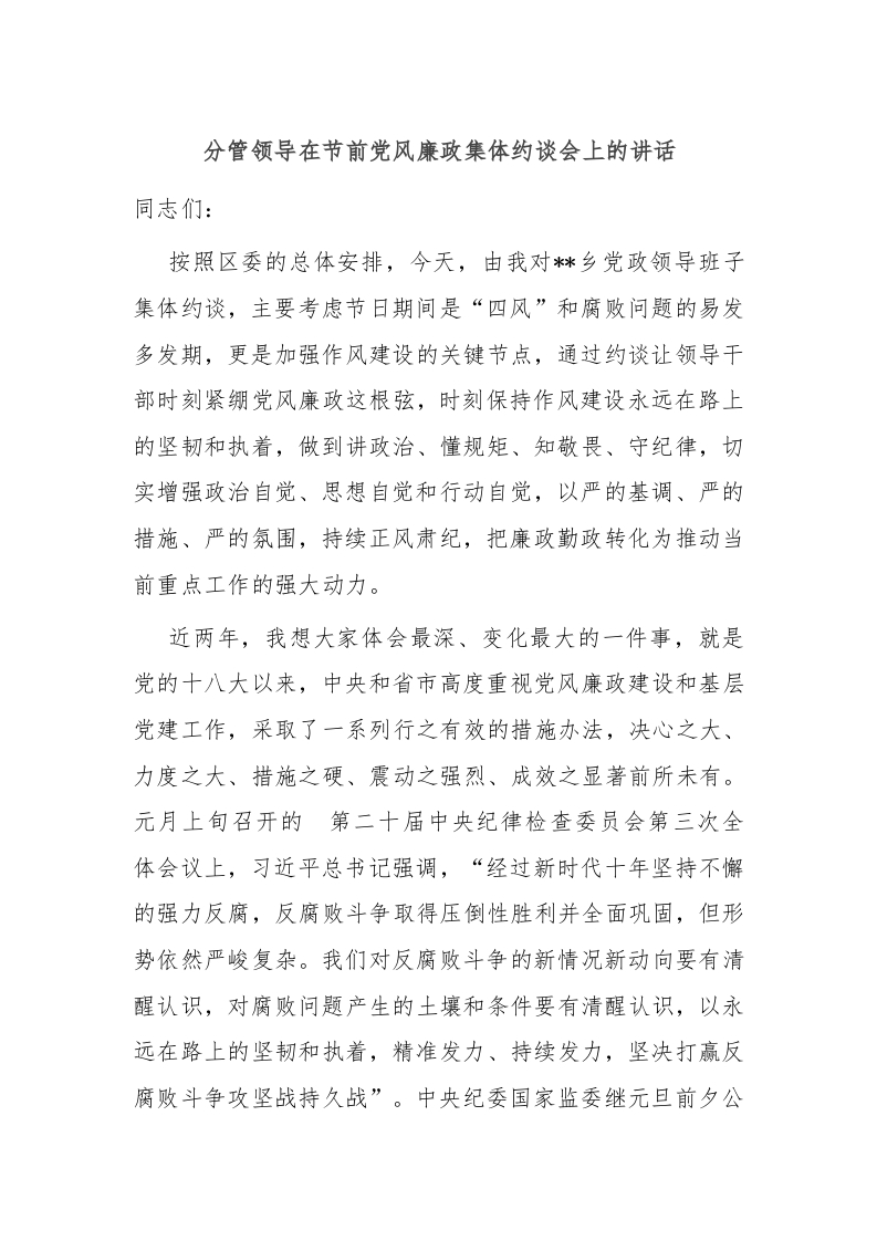 / 分管领导在节前党风廉政集体约谈会上的讲话稿