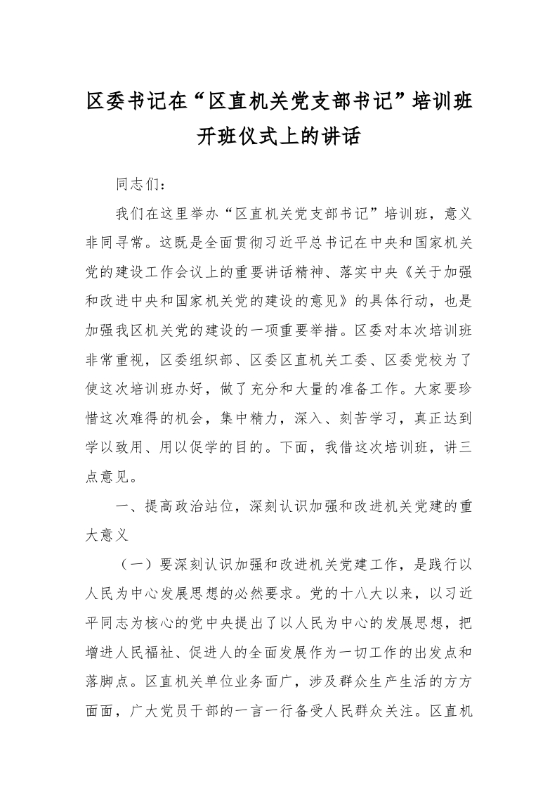 / 区委书记在“区直机关党支部书记”培训班开班仪式上的讲话稿