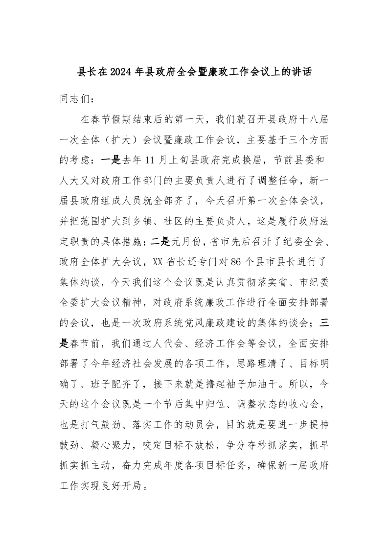 / 县长在2024年县政府全会暨廉政工作会议上的讲话稿