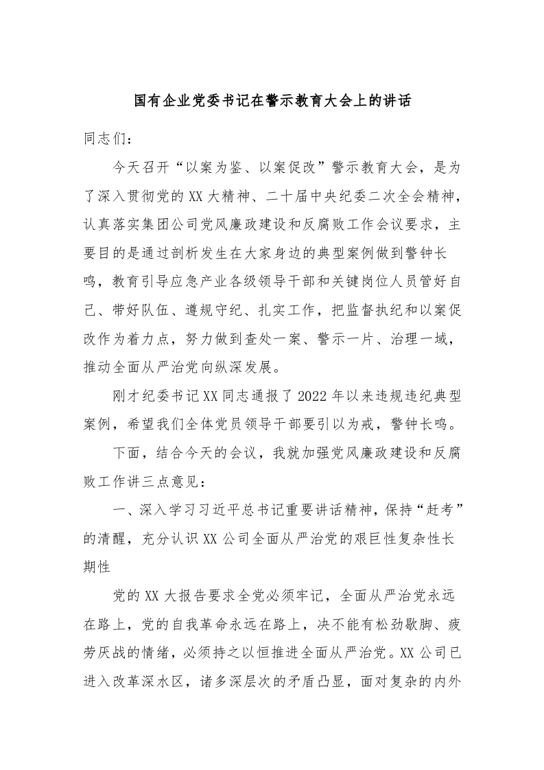 / 国有企业党委书记在警示教育大会上的讲话稿