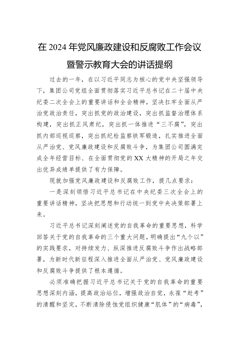 在2024年党风廉政建设和反腐败工作会议暨警示教育大会的讲话稿提纲 (集团公司)