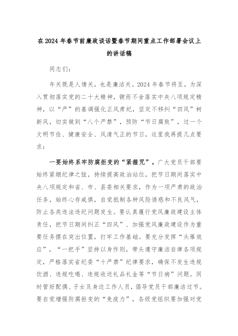 / 在2024年春节前廉政谈话暨春节期间重点工作部署会议上的讲话稿稿