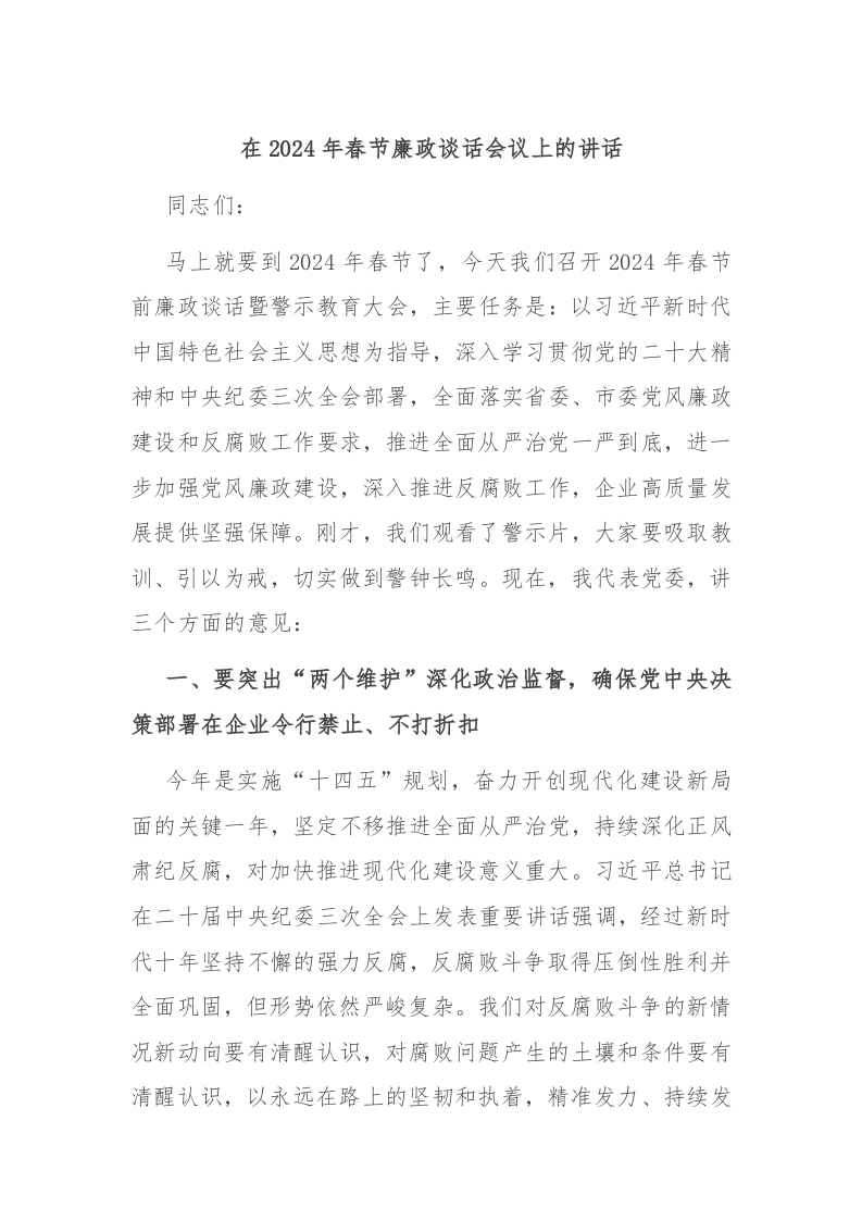 / 在2024年春节廉政谈话会议上的讲话稿
