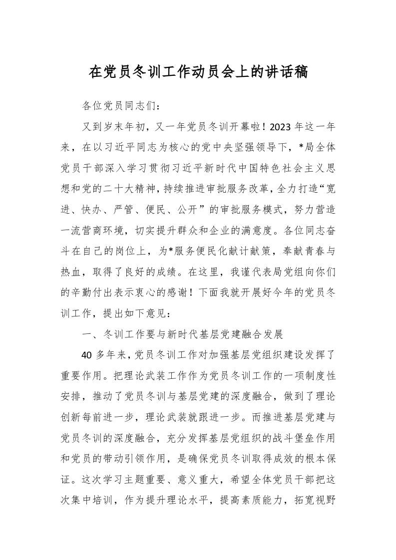/ 在党员冬训工作动员会上的讲话稿稿