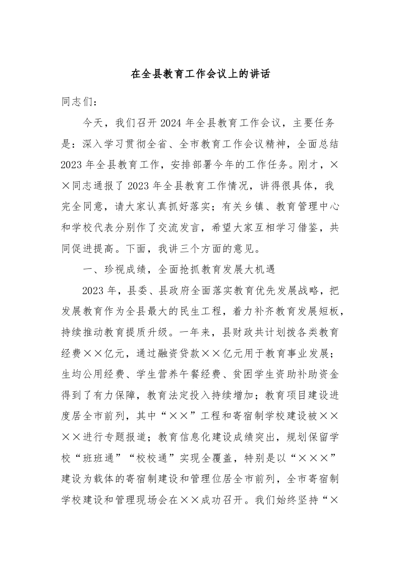 / 在全县教育工作会议上的讲话稿
