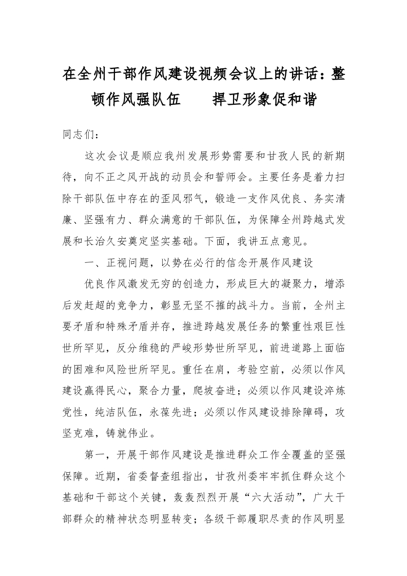 / 在全州干部作风建设视频会议上的讲话稿:整顿作风强队伍 捍卫形象促和谐