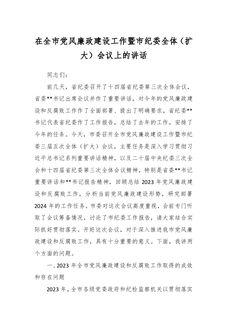 / 在全市党风廉政建设工作暨市纪委全体(扩大)会议上的讲话稿
