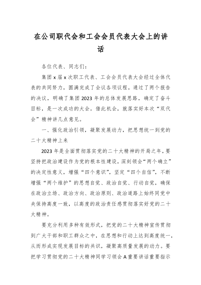 / 在公司职代会和工会会员代表大会上的讲话