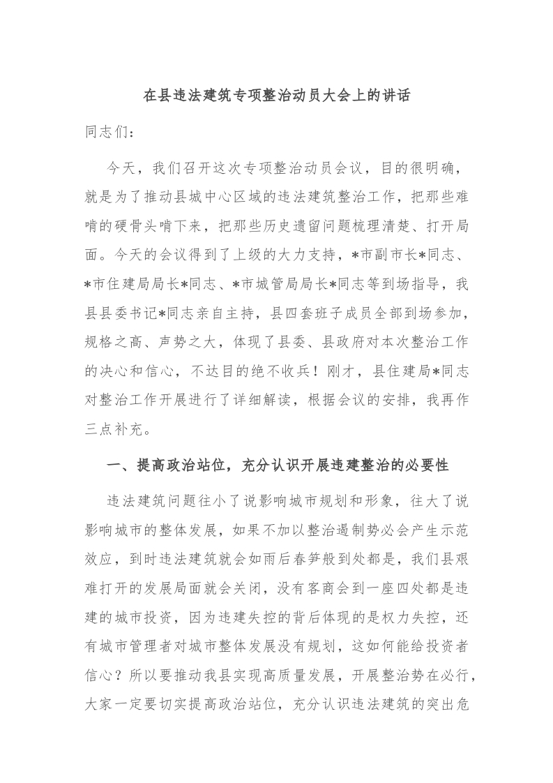 / 在县违法建筑专项整治动员大会上的讲话稿