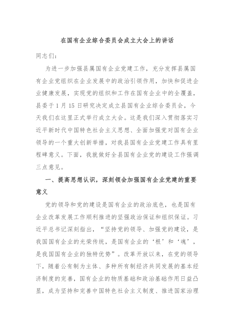 在国有企业综合委员会成立大会上的讲话稿