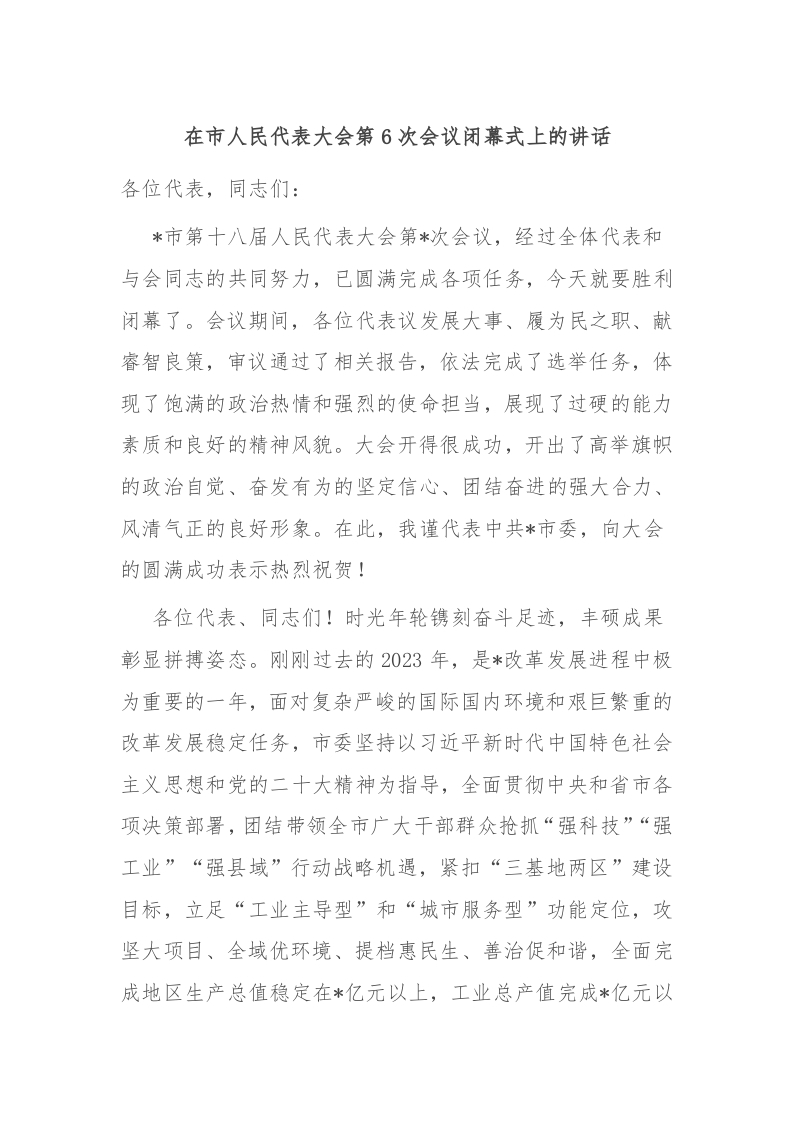 / 在市人民代表大会第6次会议闭幕式上的讲话稿