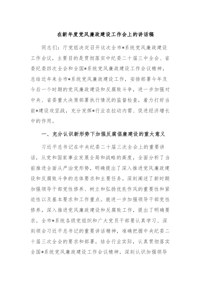 / 在新年度党风廉政建设工作会上的讲话稿稿