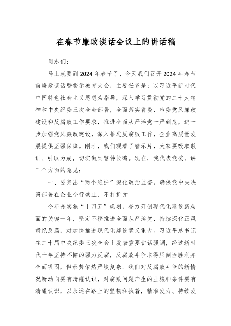 / 在春节廉政谈话会议上的讲话稿稿