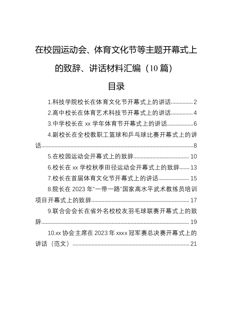 / 在校园运动会、体育文化节等主题开幕式上的致辞、讲话稿材料汇编(10篇)