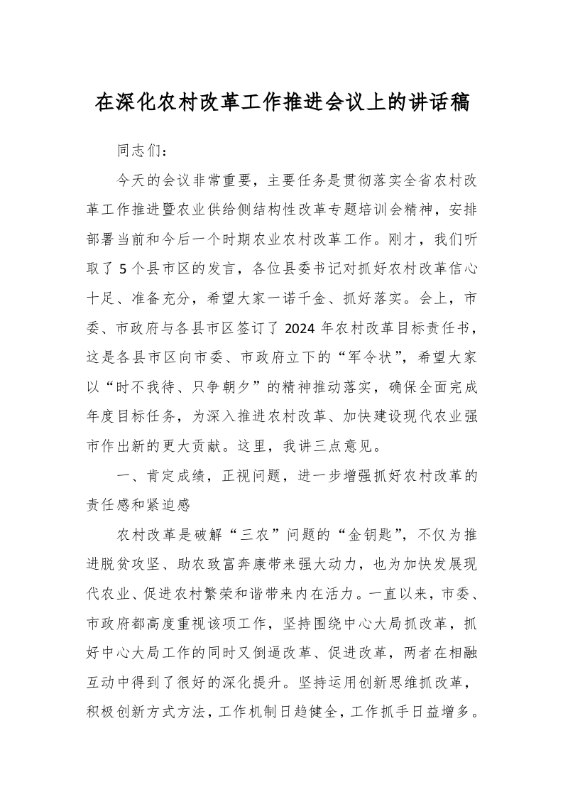 / 在深化农村改革工作推进会议上的讲话稿稿