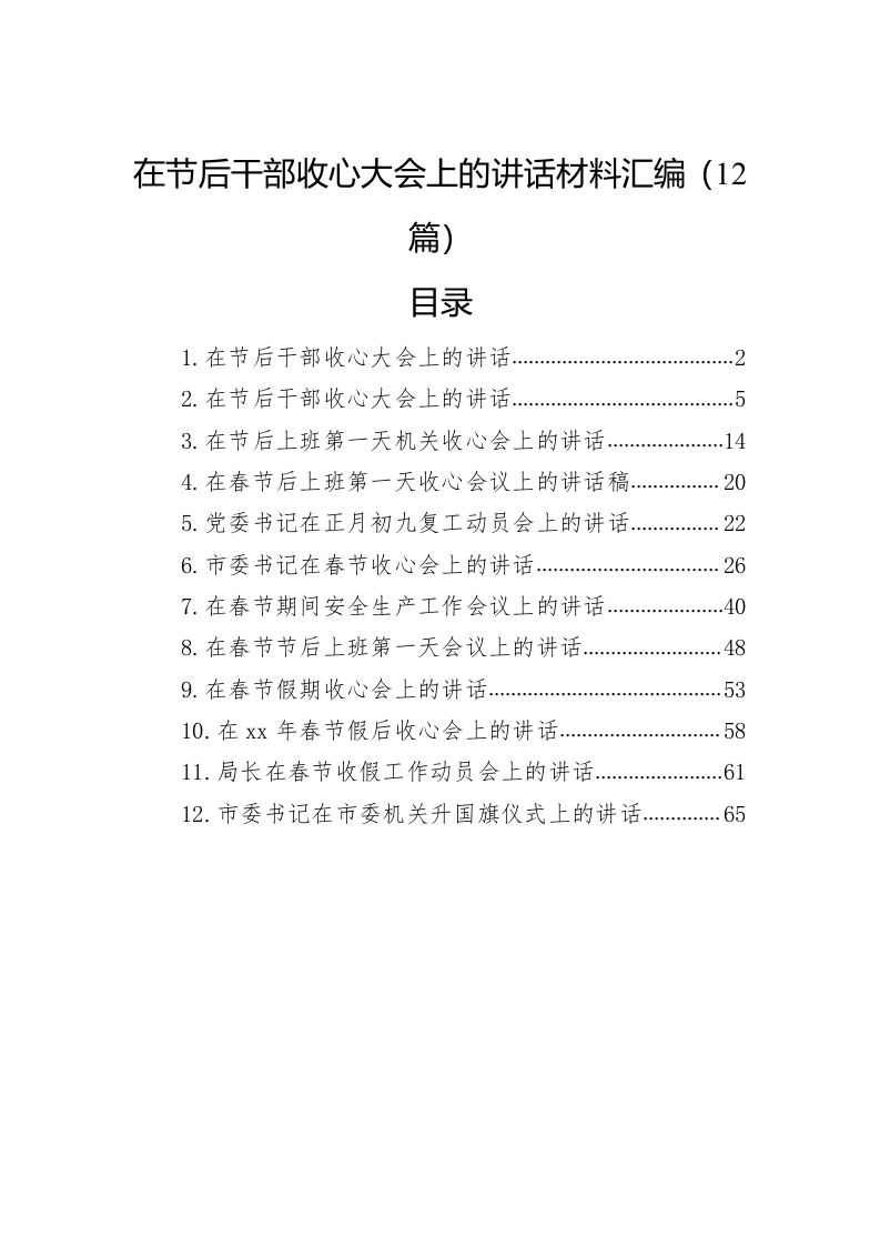 / 在节后干部收心大会上的讲话稿材料汇编(12篇)