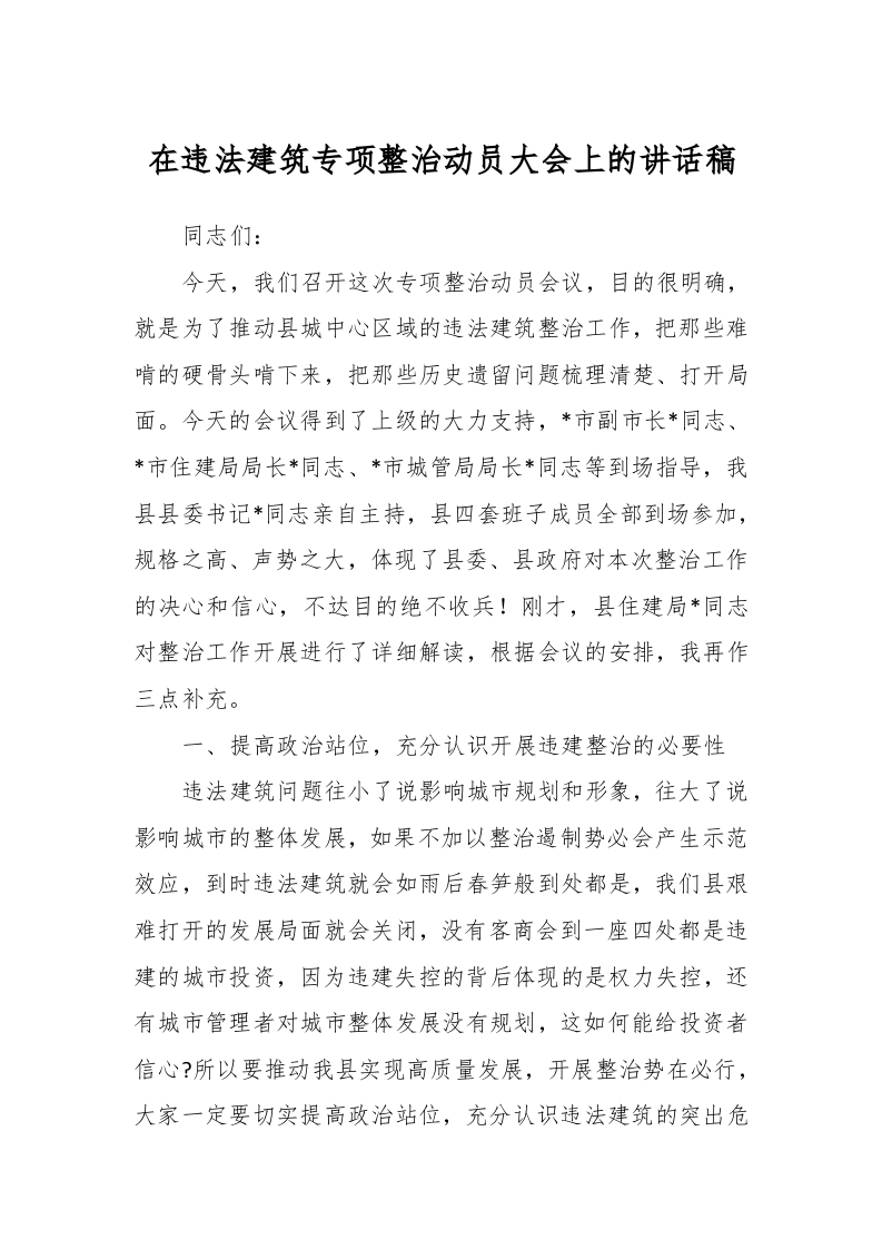 / 在违法建筑专项整治动员大会上的讲话稿稿