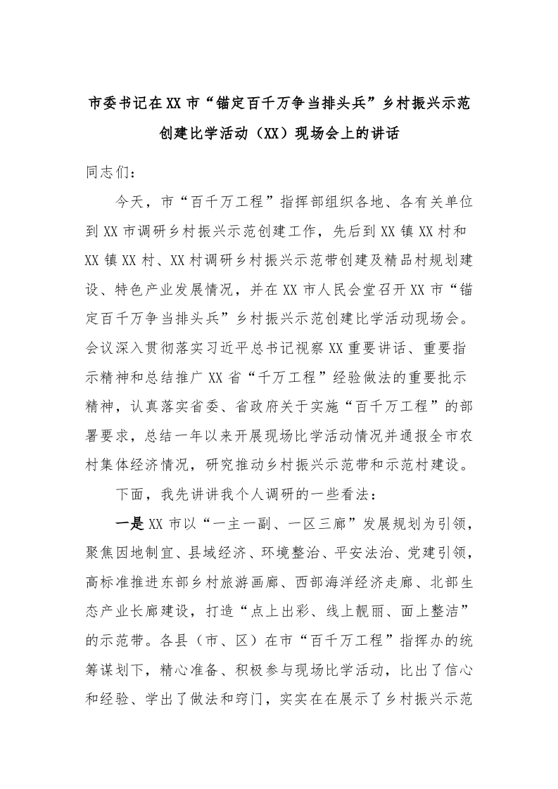 / 市委书记在XX市“锚定百千万争当排头兵”乡村振兴示范创建比学活动(XX)现场会上的讲话稿