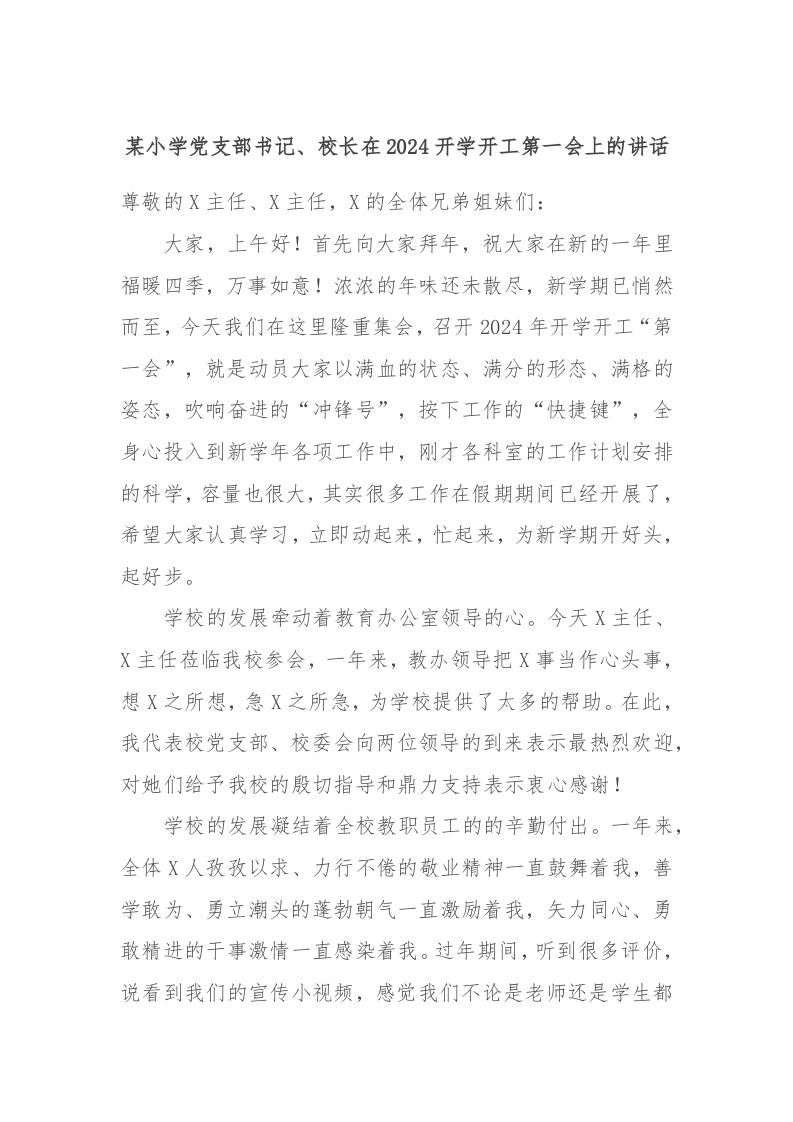 / 某小学党支部书记、校长在2024开学开工第一会上的讲话稿