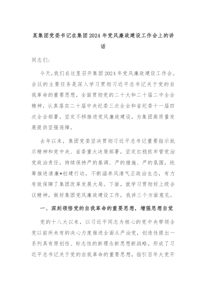 / 某集团党委书记在集团2024年党风廉政建设工作会上的讲话稿