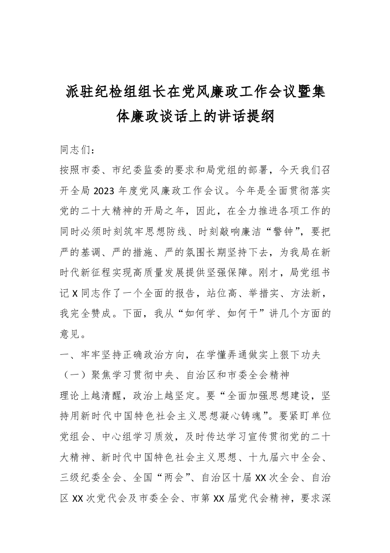 / 派驻纪检组组长在D风廉政工作会议暨集体廉政谈话上的 讲话稿提纲