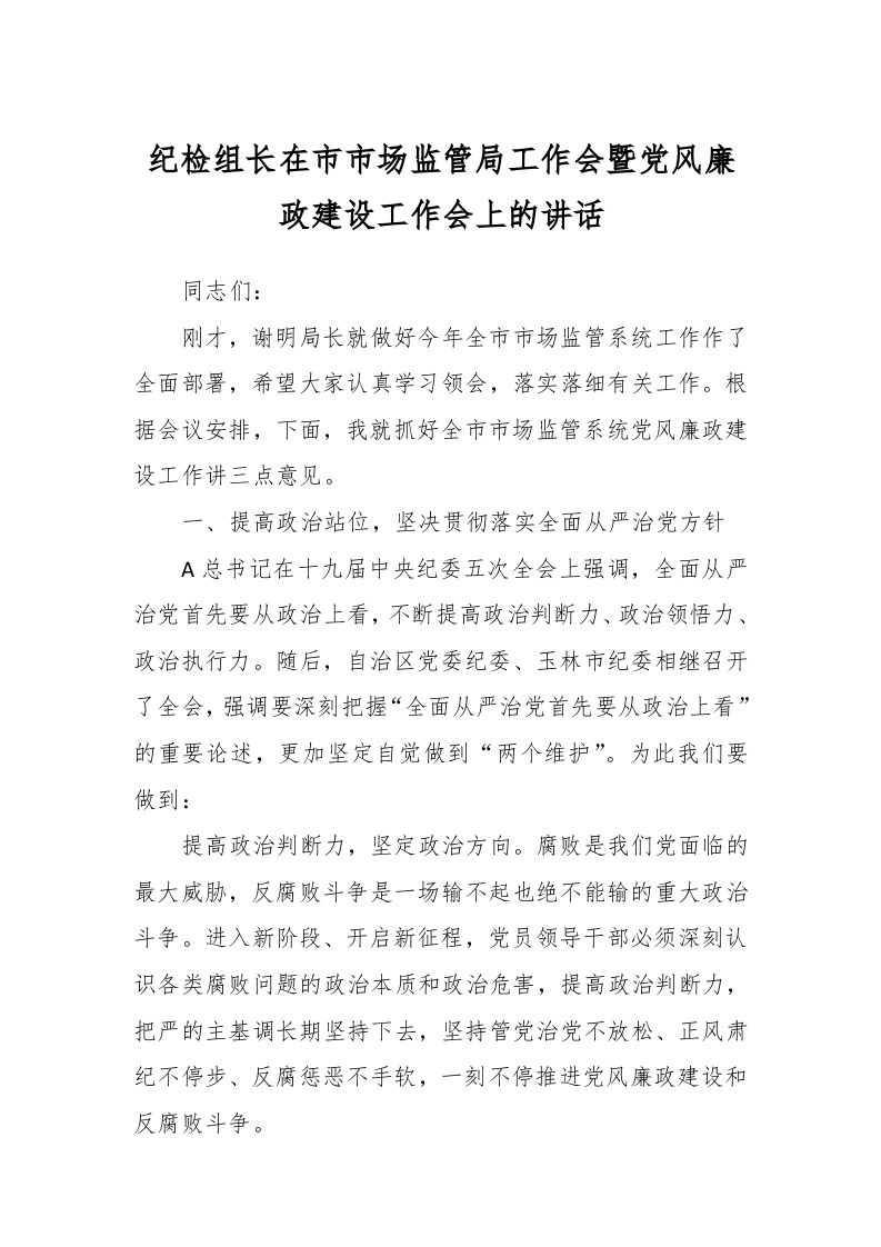 / 纪检组长在市市场监管局工作会暨党风廉政建设工作会上的讲话稿