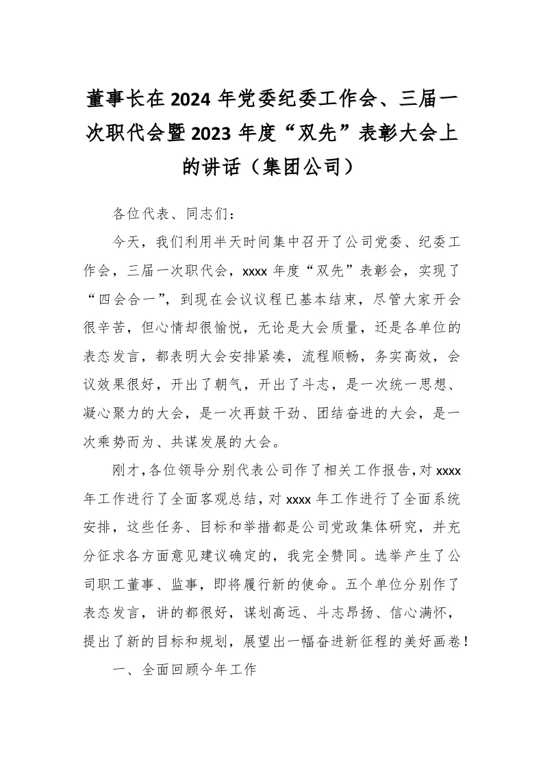 / 董事长在2024年党委纪委工作会、三届一次职代会暨2023年度“双先”表彰大会上的讲话(集团公司)