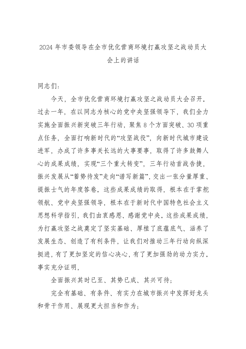 / 2024年市委领导在全市优化营商环境打赢攻坚之战动员大会上的讲话