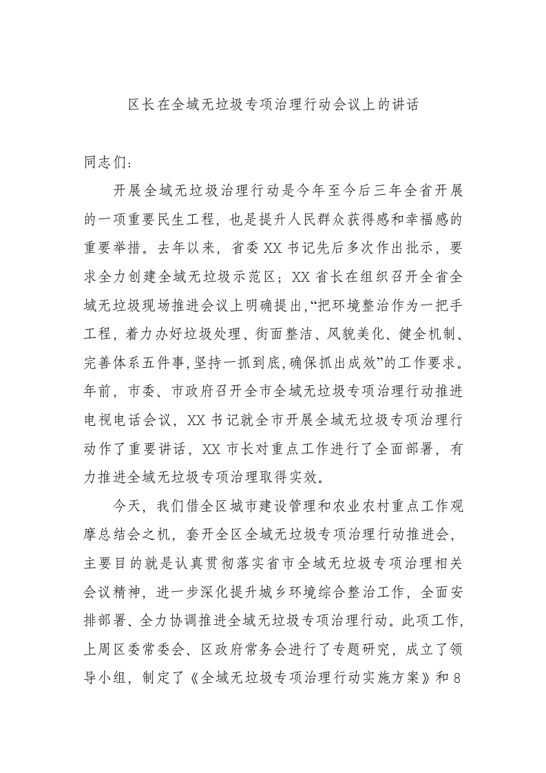 / 区长在全域无垃圾专项治理行动会议上的讲话