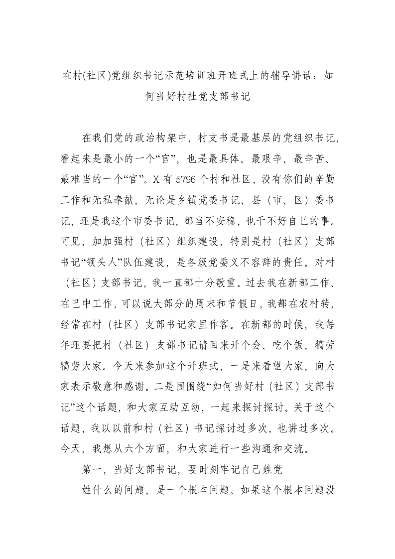 / 在村(社区)党组织书记示范培训班开班式上的辅导讲话:如何当好村社党支部书记