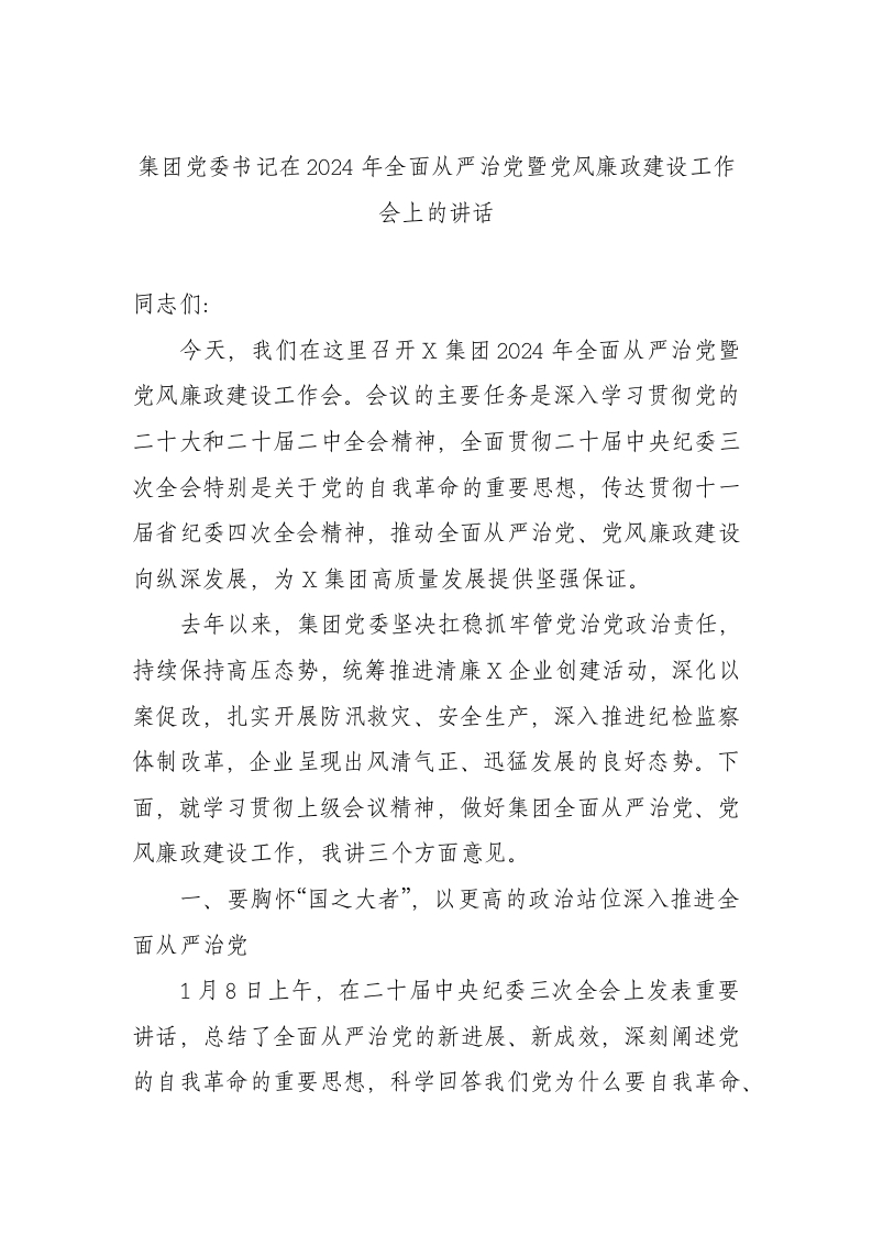 / 集团党委书记在2024年全面从严治党暨党风廉政建设工作会上的讲话