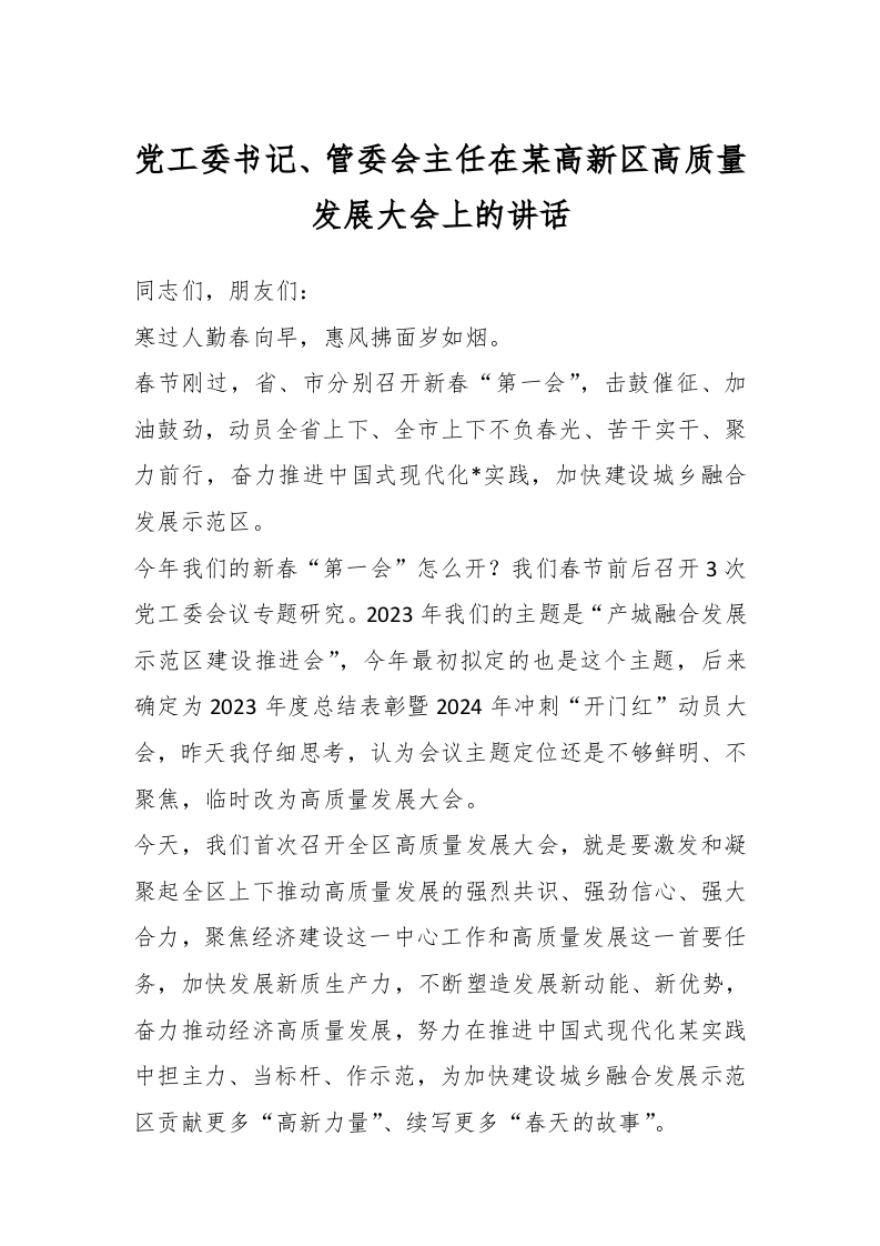 / 党工委书记、管委会主任在某高新区高质量发展大会上的讲话稿