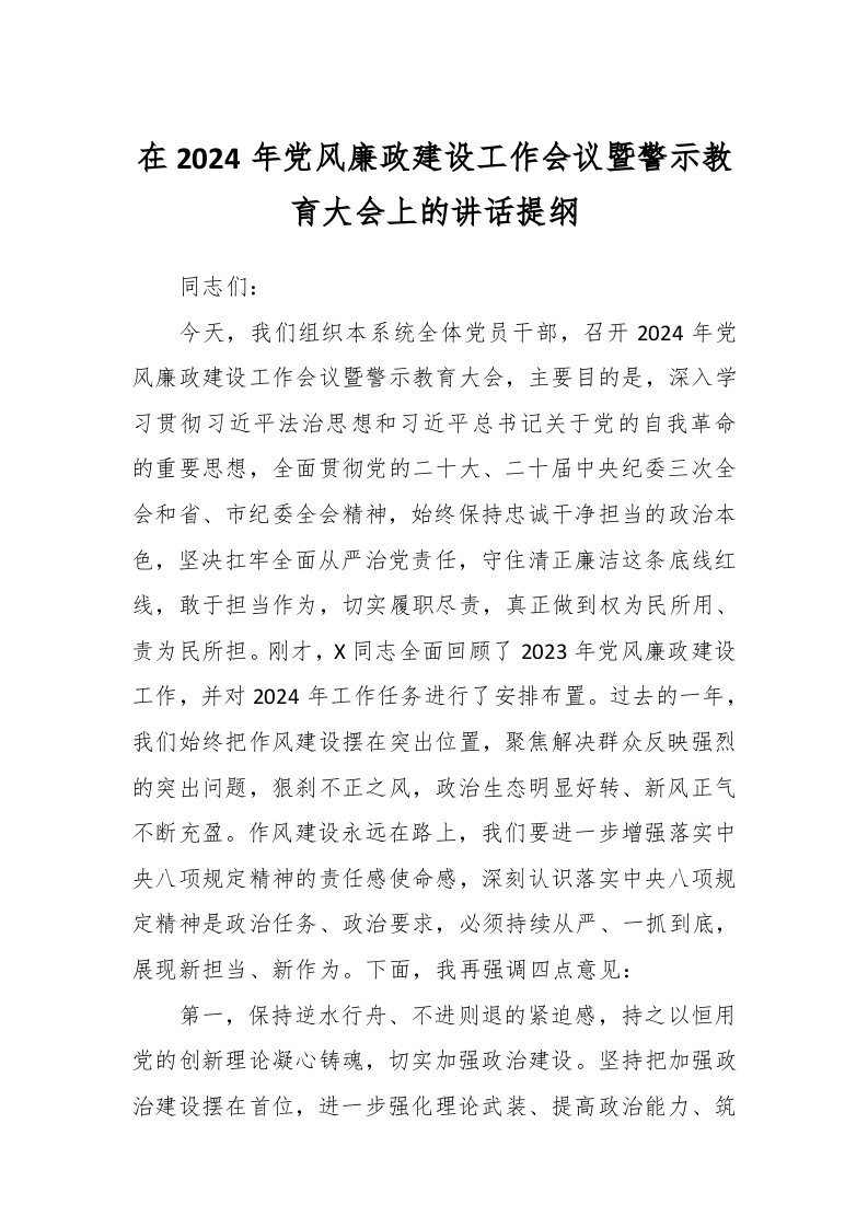 在2024年党风廉政建设工作会议暨警示教育大会上的讲话稿提纲