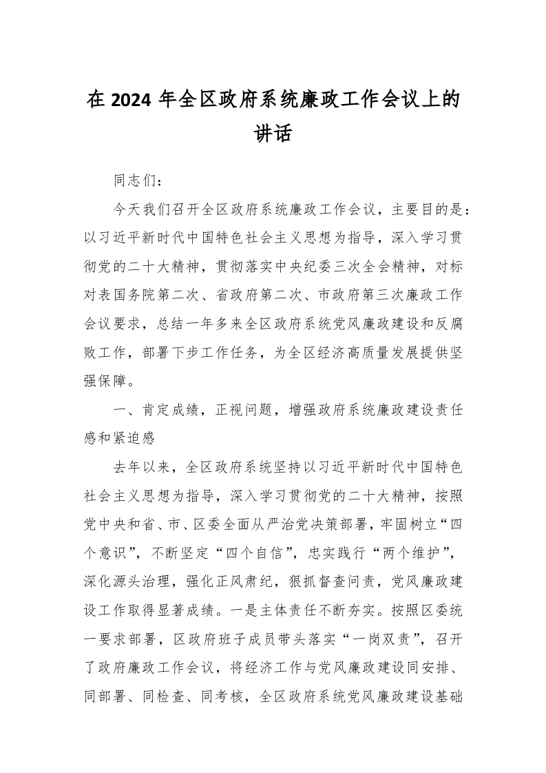 / 在2024年全区政府系统廉政工作会议上的讲话稿