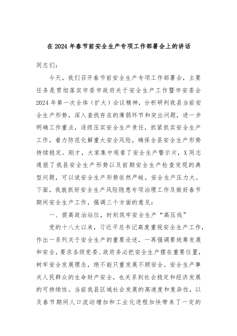 / 在2024年春节前安全生产专项工作部署会上的讲话稿